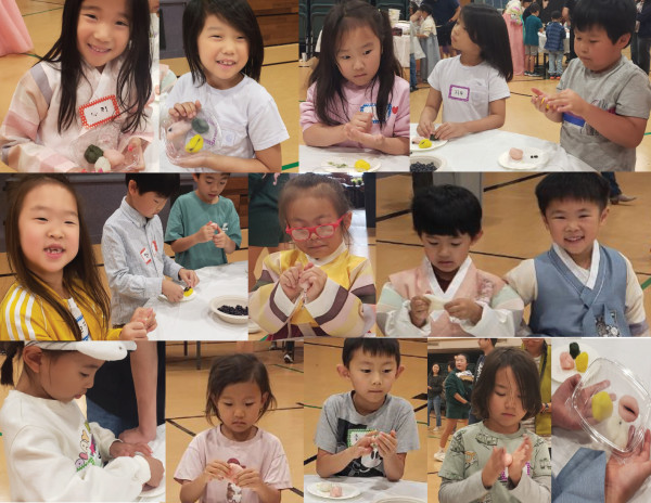 In the auditorium, everyone participated in making songpyeon (traditional rice cakes), and afterward we returned to class to play Yutnori and Jegichagi.