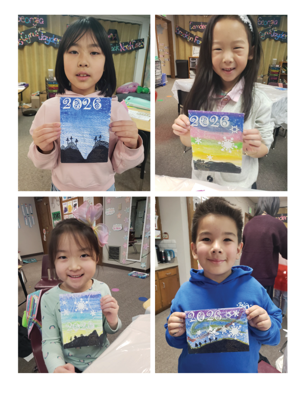 This week, we worked on a 2026 New Year card-making activity using oil pastels. The students created a gradient sky background by blending the oil pastels, drew auroras on top, added the “2026” lettering, and finished their artwork by stamping. It was wonderful to see the children enjoy experimenting with colors and creatively completing their projects.