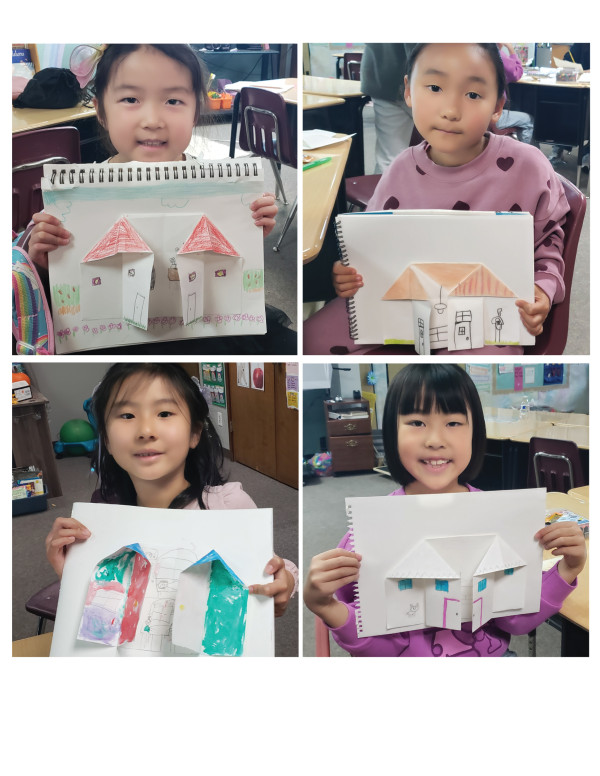 The children first folded a piece of colored drawing paper into the shape of a house. On the front side, they sketched the exterior (outside view) of the house, and on the inside, they drew the interior (inside view).