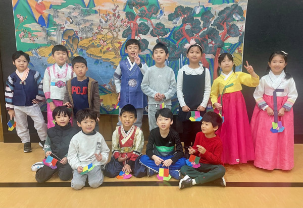 *학생들은 세배(새해인사)에 대해 배우고, 제기차기, 윷놀이와 같은 전통 놀이를 공부하고 즐거운 시간을 보냈습니다. 학생들이 받은 세배돈을 넣을 수 있도록 종이색동복주머니를 만들어 줬는데, 그 복주머니(보통 새해를 맞아 아이들에게 행운을 기원하며 주는 주머니)를 들고 있는 학생들이 너무 귀여웠습니다.