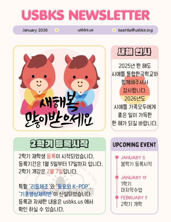 2026 01 10 페이지 정보 작성자 시애틀캠퍼스 작성일26-01-05 17:44 조회196회 댓글0건 관련링크 목록 본문 2026년 붉은 말의 해! 새해 복 많이 받으세요. 오전 9시 30분에 교실에서 뵐게요 댓글목록 등록된 댓글이 없습니다. 목록