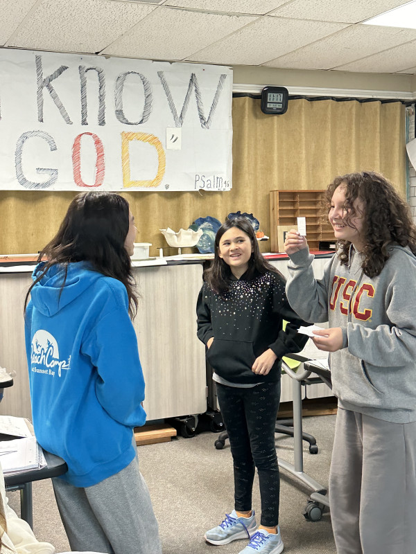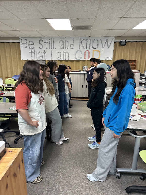 Students played a greeting game where they stood in two lines and rotated to greet each other.