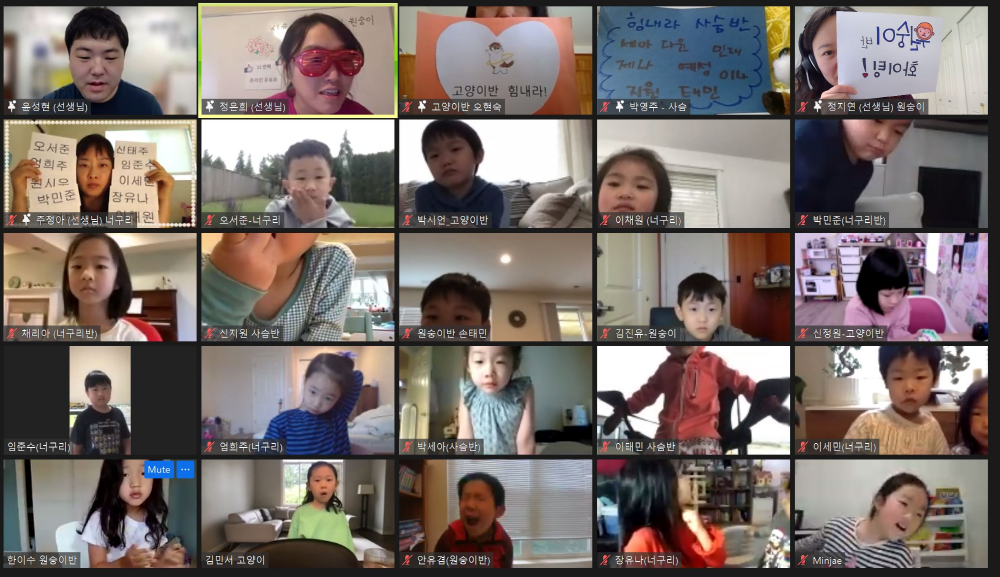 벨뷰 통합한국학교(교장 권은정)가 원격수업이 진행되는 이번 학기에도 유아,유치반 학생들을 위한 온라인 운동회를 개최해 화제다. 이번 온라인 운동회는 지난 주말인 22일 두 개의 그룹으로 나뉘어 진행됐다. 비슷한 한글 수준으로 나뉜 사슴, 원숭이, 고양이, 너구리반 총 31명과 나비, 다람쥐, 강아지, 코알라반 36명의 학생이 참여했다.